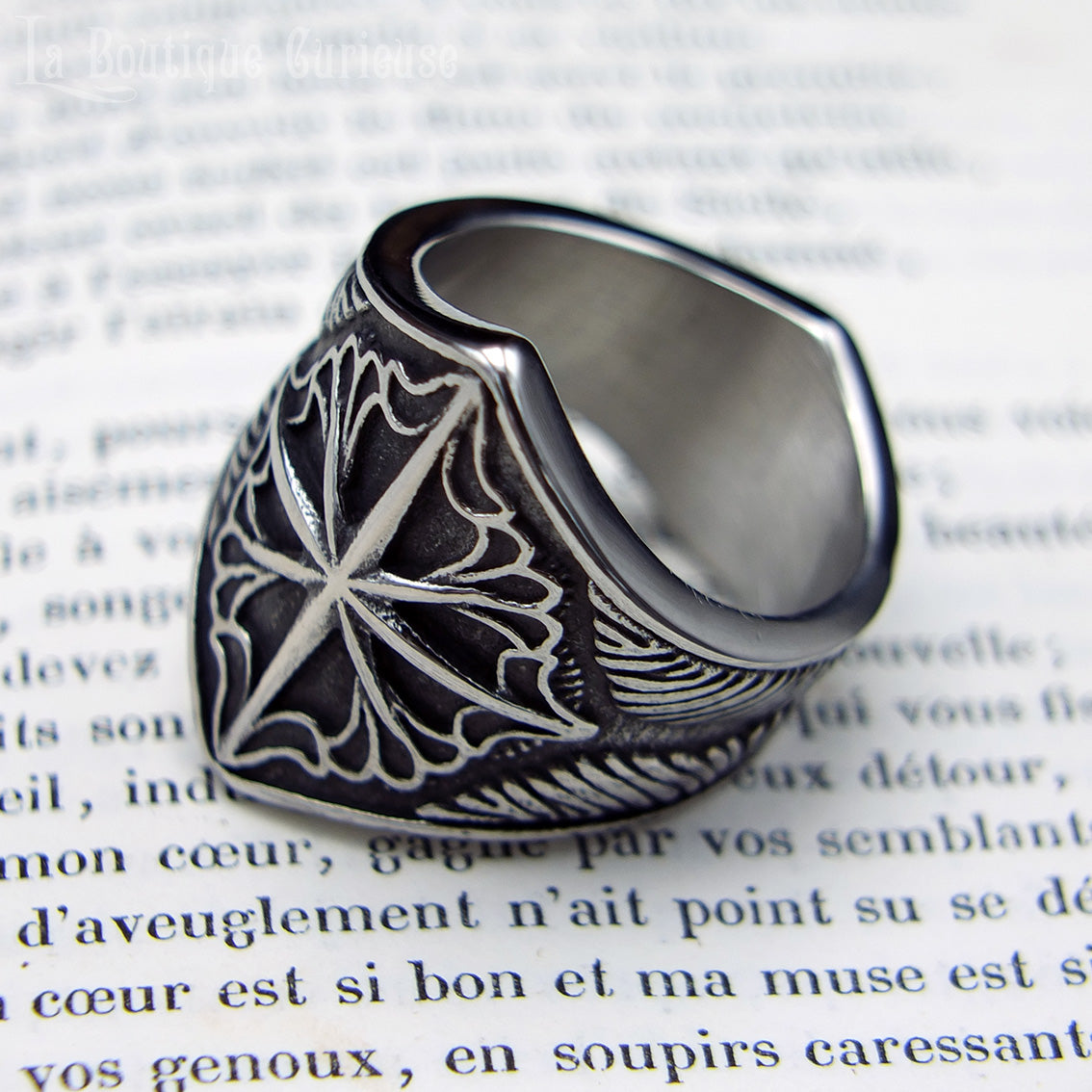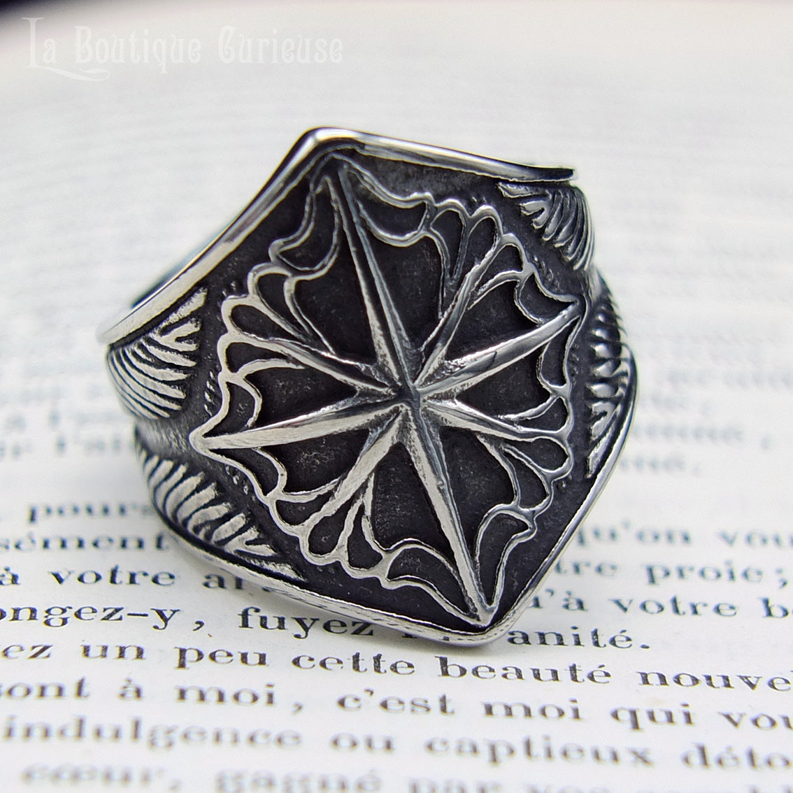 Une bague à la symbolique profonde, gravée d'une rose des vents finement ouvragée et ornée d'ailes sur ses côtés comme une invitation au voyage et à la liberté.