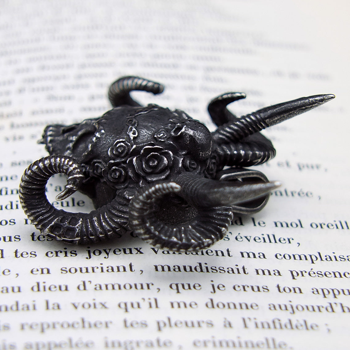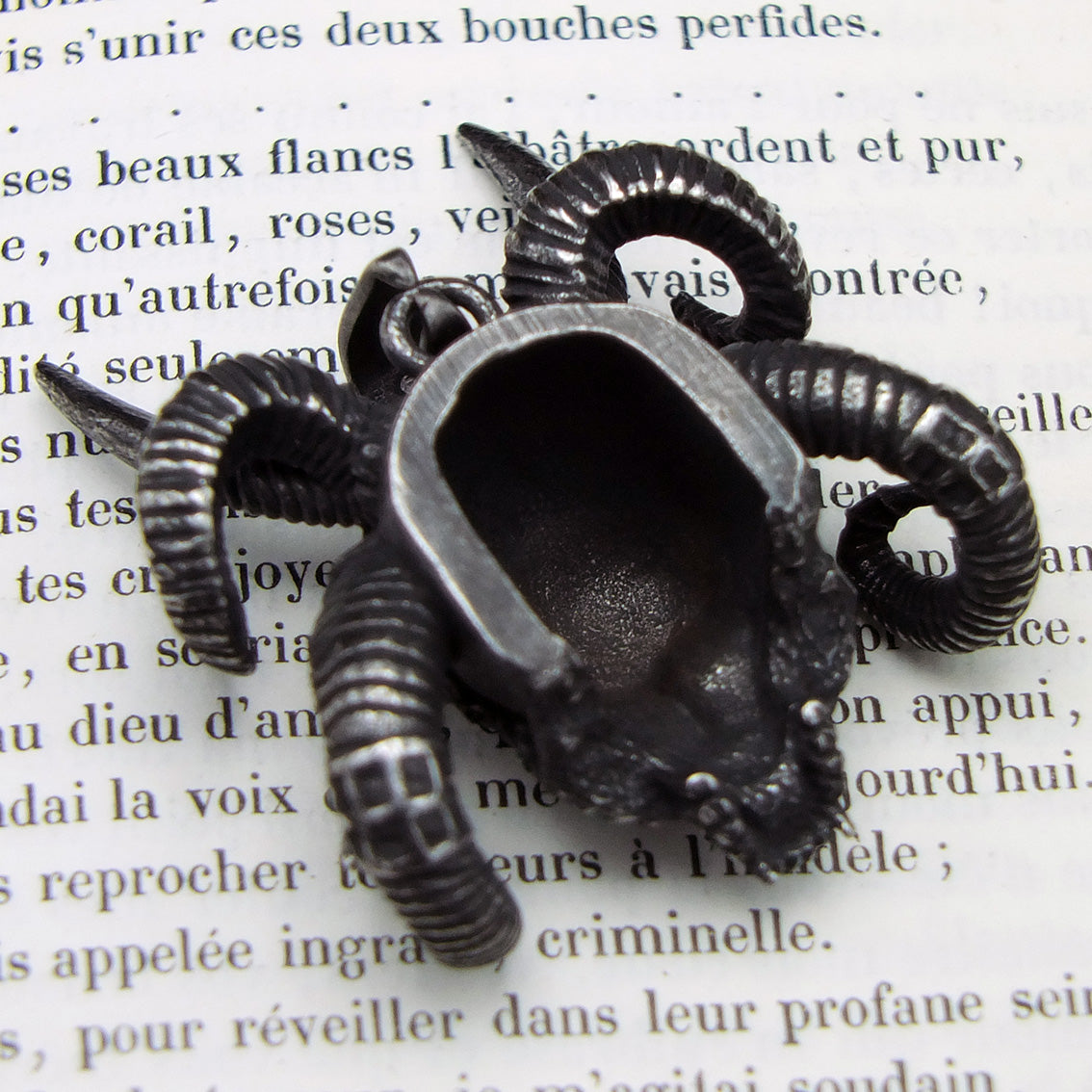 Très présent dans l’esthétique gothique, le crâne incarne le dépassement du tabou de la mort et sa désacralisation. Ceux qui osent ce dépassement se libèrent de la peur de la mort et par extension des codes de la société. Sur ce pendentif, le crâne prend une dimension plus sombre encore, se parant de cornes sculptées évoquant des entités démoniaques, destructrices ou protectrices selon les cultures.