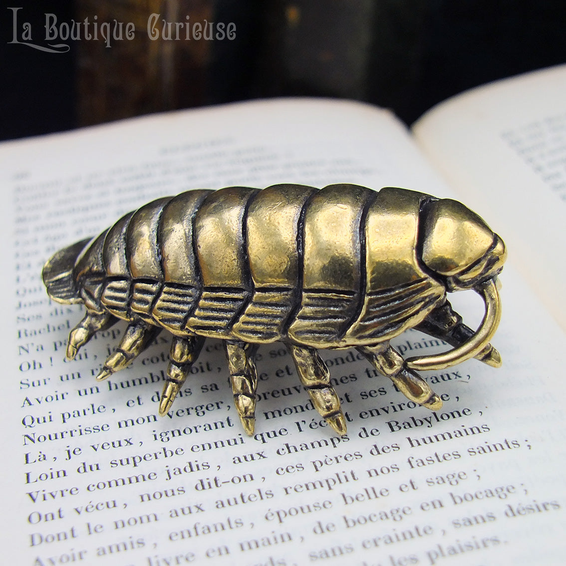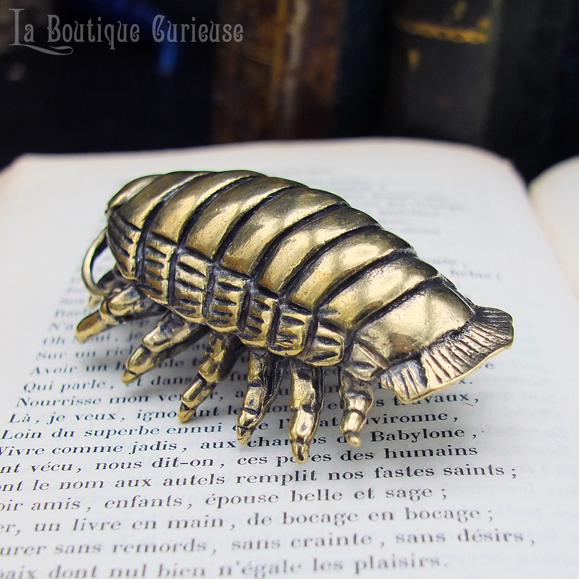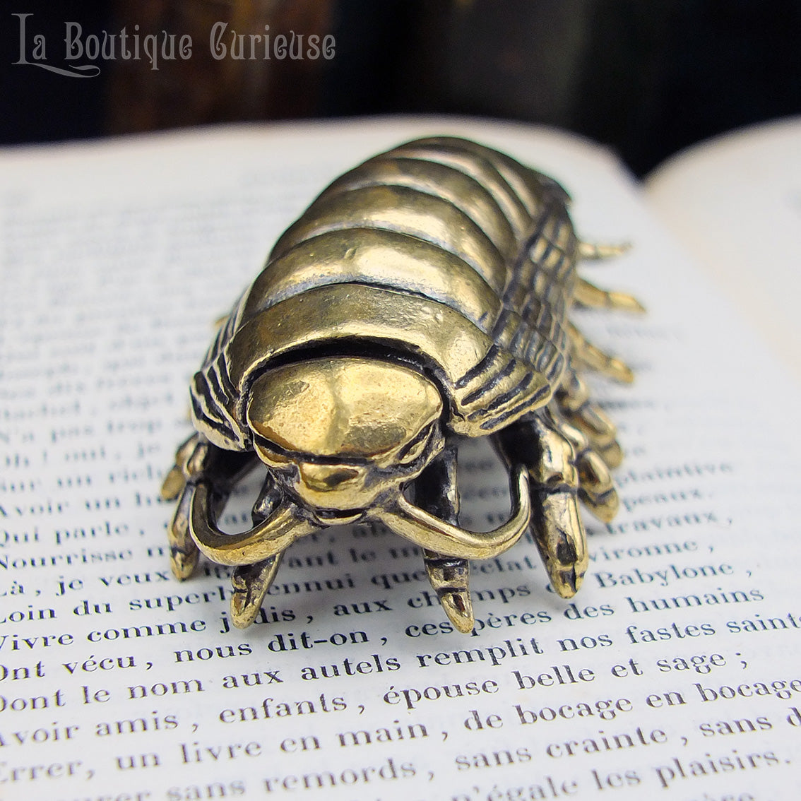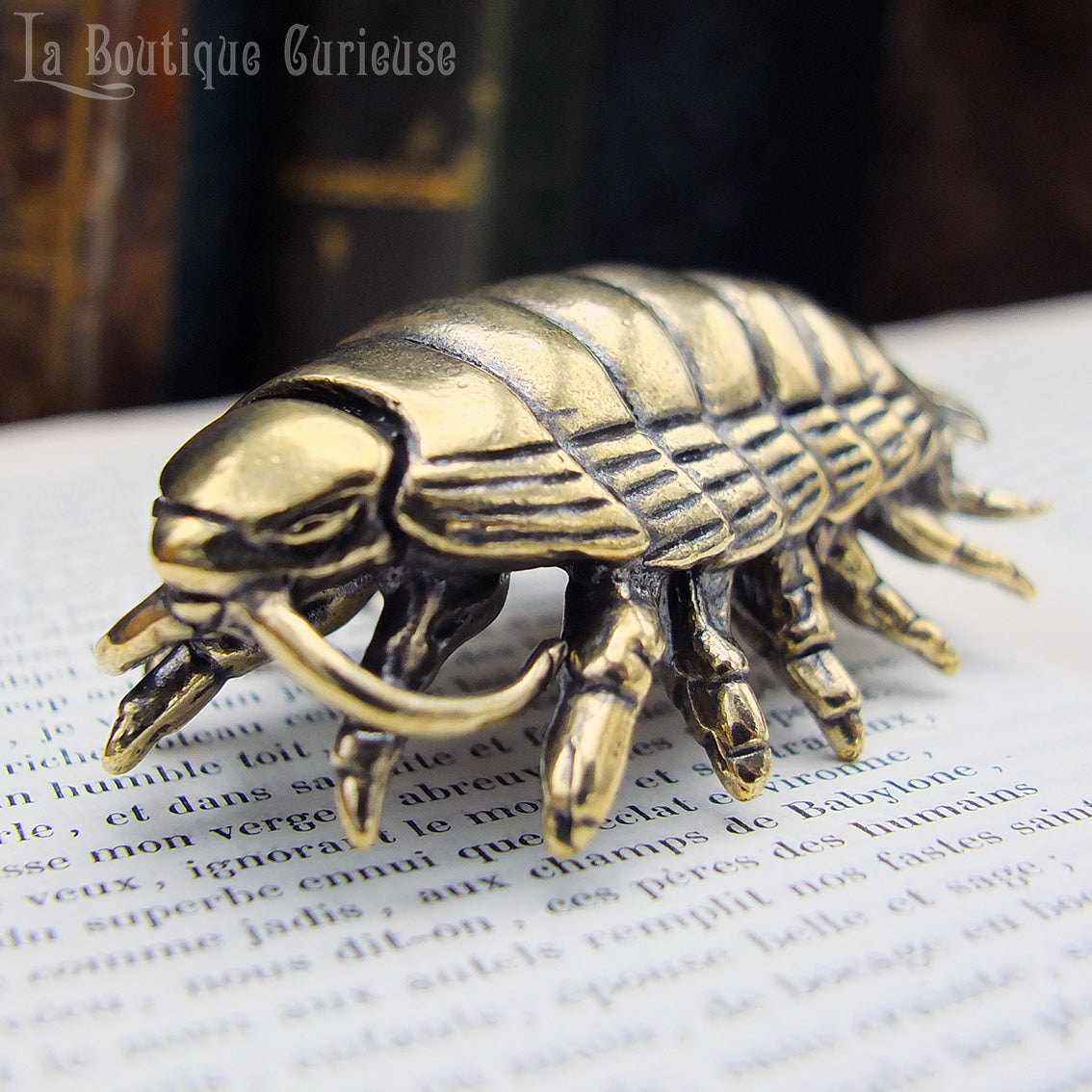 Chaque détail de cet isopode a été soigneusement sculpté pour restituer son allure singulière. Le laiton patiné renforce son aspect organique et ancien, donnant l’impression d’un vestige remonté des abysses ou d’un spécimen échappé d’un cabinet de curiosités.